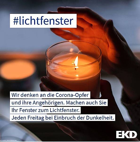 Die Aktion #lichtfenster regt dazu an, an jedem Freitag bei Einbruch der Dämmerung ein Licht gut sichtbar in ein Fenster zu stellen - als Zeichen des Mitgefühls: in der Trauer um die Verstorbenen, in der Sorge um diejenigen, die um ihr Leben kämpfen, Mitgefühl mit den Angehörigen der Kranken und Toten.