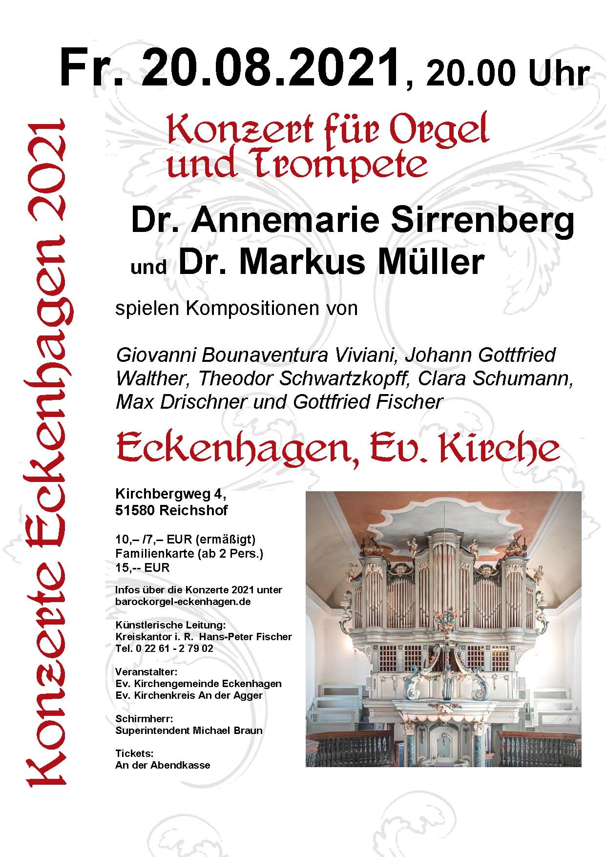 Egal, wie das Wetter wird: Dieses Konzert findet statt. Die Evangelische Kirchengemeinde in Eckenhagen lädt gemeinsam mit dem Evangelischen Kirchenkreis An der Agger zu einem sommerlichen Konzert für Trompete und Orgel in die Eckenhagener Barockkirche. Am Freitag, den 20. August, präsentieren ab 20 Uhr Kreiskantorin Annemarie Sirrenberg (Orgel) und Markus Müller (Trompete) festliche und virtuose Suiten und Concerti barocker Meister. Zudem verführen romantische und moderne Orgelmusik oder auch mal ein populäres Sommerlied – einen abwechslungsreichen Abend können die Besucherinnen und Besucher also erwarten. Die Schirmherrschaft über dieses besondere Konzert und weitere in der Kirche hat Superintendent Michael Braun übernommen, die künstlerische Leitung der Konzert-Reihe hat Hans-Peter Fischer, Kreiskantor im (Un)Ruhestand, inne.