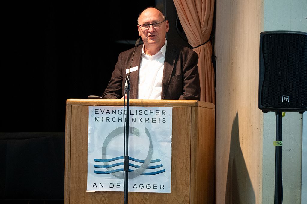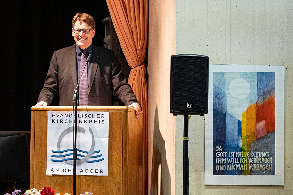 Als zweiten Aufgabenbereich nannte Michael Braun die Fragen nach Finanzen, Personal und Gebäuden. "Auch das Schiff unserer Kirche schaukelt in den jetzigen Stürmen schwer." Viele Hauptamtliche gingen in den nächsten Jahren in den Ruhestand, bald gebe es mehr Pfarrerinnen und Pfarrer im Ruhestand als im aktiven Dienst. Etliche Gebäude müssten dringend renoviert werden. "Man sieht auch, dass das nicht bei allen zu bezahlen ist und man sie auch nicht immer braucht." Der Superintendent ermutigte zum Handeln: "Ein gutes Maß an Sorgen - ja! Aber dann kein Verharren beim Blick zurück. Wer hier um den Kernauftrag der Kirche weiß und mit ruhiger Überlegung möglichst direkt und umkomplizert die Dinge angeht, ist auf dem Weg."