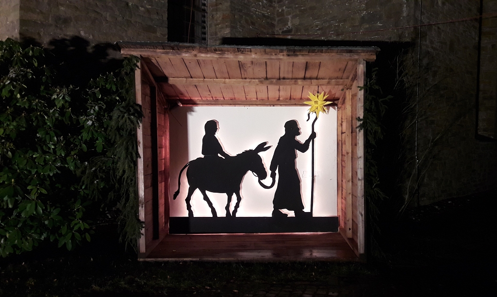 Die Evangelische Kirchengemeinde Hülsenbusch-Kotthausen lädt ein zu einem besonderen Adventskalender. Jeden Tag leuchtet ein weiterer Baum vor der Kirche mit der barocken Turmhaube. Die Krippe neben dem Eingang nimmt Gestalt an. So wird die Kirche zu einem Anlaufpunkt rund um die Uhr für die Gemeinde und Besucherinnen und Besucher von außerhalb. Die Idee hatte ein Gemeindemitglied und etliche Menschen aus dem Dorf packten mit an, um den Wald zu realisieren.