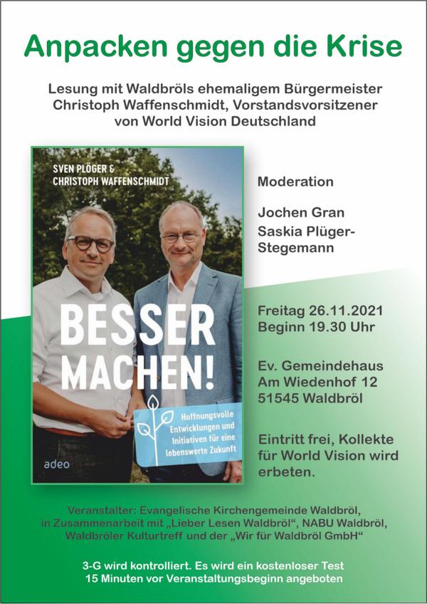 ‚Anpacken gegen die Krise‘ unter dieser Überschrift findet am Freitag, 26. November 2021, 19.30 Uhr eine Lesung mit Waldbröls ehemaligem Bürgermeister Christoph Waffenschmidt im evangelischen Gemeindehaus, Am Wiedenhof 12, in 51545 Waldbröl statt. Waffenschmidt ist seit 2008 Vorstandsvorsitzender des Kinderhilfswerks World Vision Deutschland.