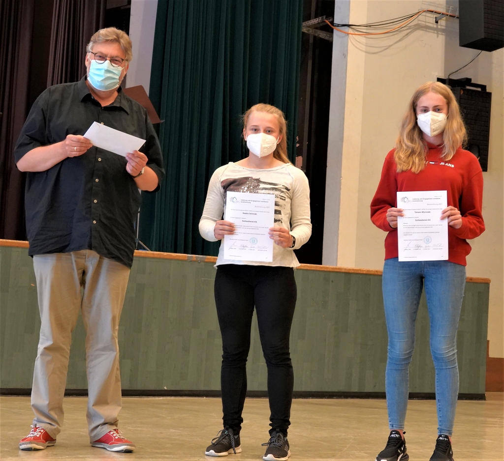 Geehrt wurden zwei Schülerinnen aus der Gottesdienst-AG der 11. Klasse: Saskia Schmidt und Tamara Mlynczak für sieben Jahre Engagement im Schulgottesdienst zusammen mit Pfarrer Hans-Georg Pflümer. Pflümer übereichte den "Bücherpreis der Kirchenkreises" an Tamara Mlynczak für eine Klausur in Religion über die „Gerechtigkeit Gottes“ mit herausragendem Ergebnis. Superintendent Michael Braun und Schulreferent Matthias Weichert gratulierten in einem persönlichen Brief. Dazu gab es einen Buchgutschein über 30 Euro. Hans-Georg Pflümer ist stolz auf seine Schülerinnen und Schüler: „Meines Wissens ist eine Gottesdienst-AG in einer Schule einzigartig.“