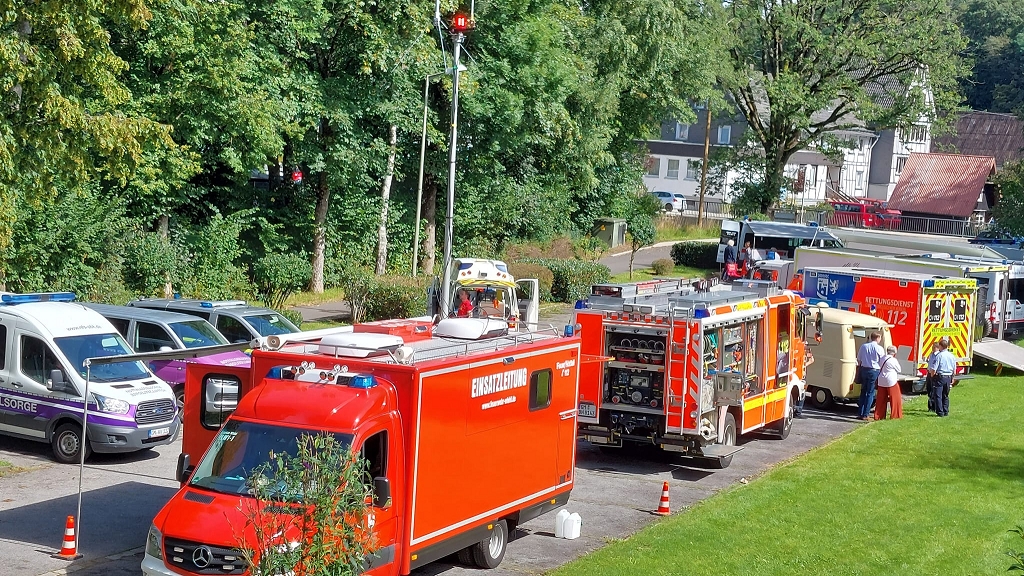 Aus dem Kreis der Besprechung kam dann auch die Idee mit der begleitenden Fahrzeugausstellung. Es gab Fahrzeuge von Polizei, Feuerwehr, Rettungsdienst, Deutsches Rotes Kreuz (DRK), Technisches Hilfswerk (THW), Deutsche Lebensrettungesellschaft (DLRG), Johanniter-Unfal-Hilfe und Notfallseelsorge. Verwegen wie ich sein kann, habe ich auch versucht, den Rettungshubschrauber Christoph 25 für eine Stippvisite zu gewinnen. Das hat leider nicht geklappt. An dieser Stelle ein großes Dankeschön an alle ‚Mitmacher‘.