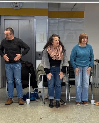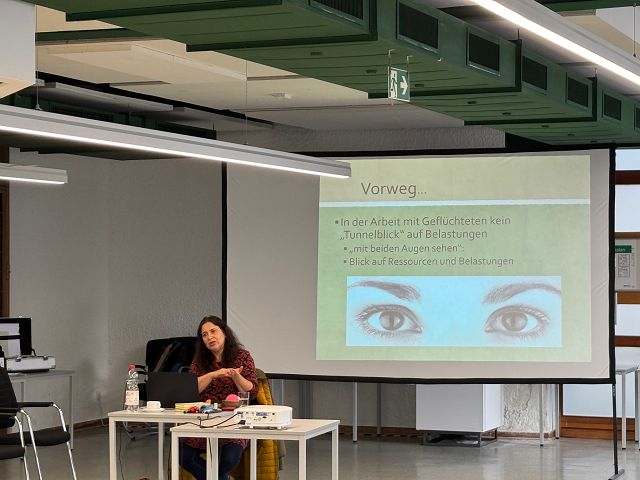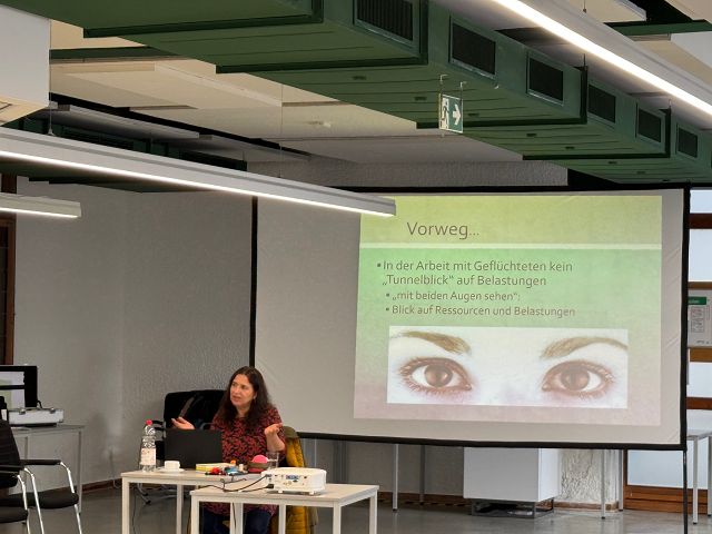 Wichtig ist der eigene Einsatzort in der Flüchtlingsarbeit als sicherer Ort. „Inseln der Sicherheit schützen vor dem Ertrinken“, formuliert es Referentin Dima Zito. Die Teilnehmenden übten Atemtechniken für die innere Sicherheit. Ausprobiert wurden auch Bewegungstechniken und Ablenktechniken zur Selbstberuhigung und zur Reorientierung bei Dissoziationen („Dissoziationsstopp“), wenn Menschen nicht mehr ansprechbar sind. Dann kann es helfen, sie abzulenken durch Gespräch und Bewegung, vielleicht einfach mal zusammen lachen. Eine Technik ist das Visuell-nach-außen-Gehen, wenn man im Moment von inneren Bildern gefangen ist. Dann kann es helfen, zum Beispiel drei rote Gegenstände im Raum zu benennen.