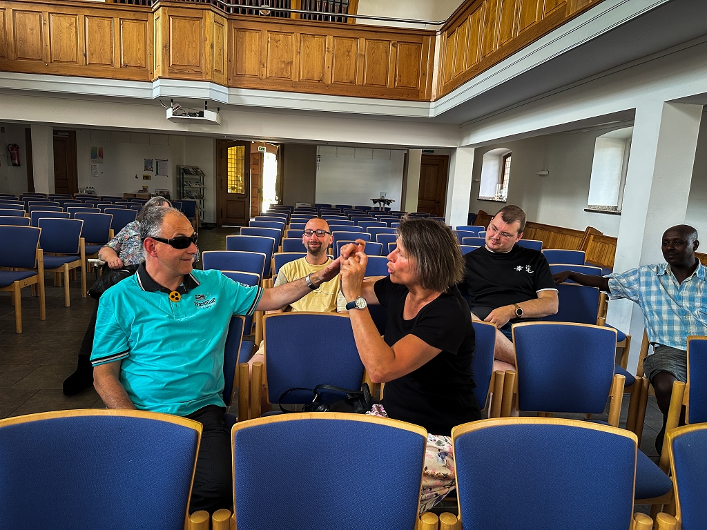 Beim anschließenden Kaffeetrinken, bei dem die Gottesdienstbesuchenden angeregt miteinander plaudern, erläutert die Theologin, dass jedes Land seine eigene Gebärdensprache hat, da die Sprache Gehörloser sich an der jeweiligen gesprochenen Sprache orientiert. Auch Gebärdensprache entwickele sich übrigens immer weiter, sagt Dagmar Schwirschke.