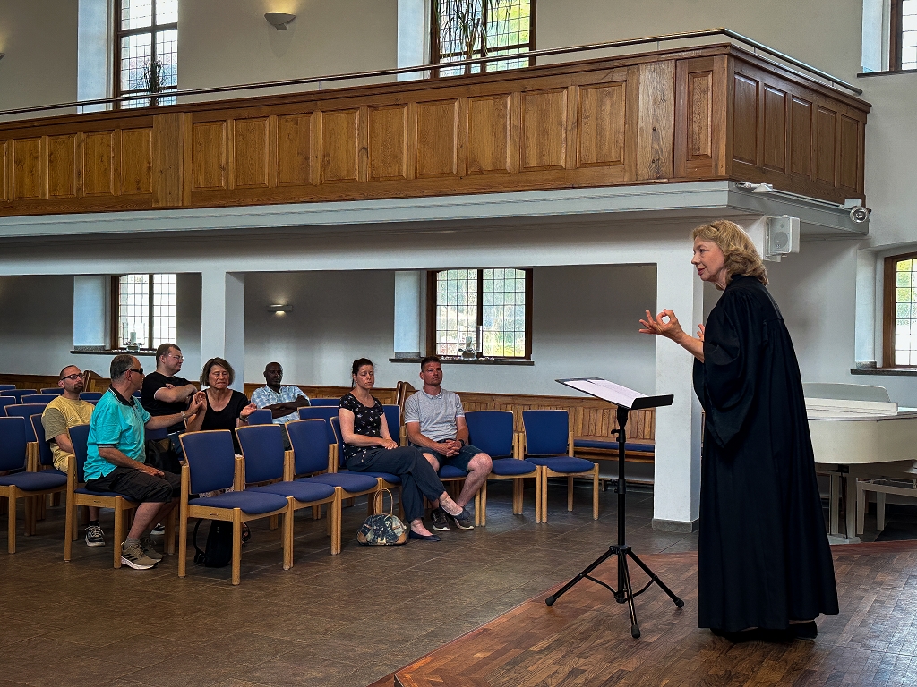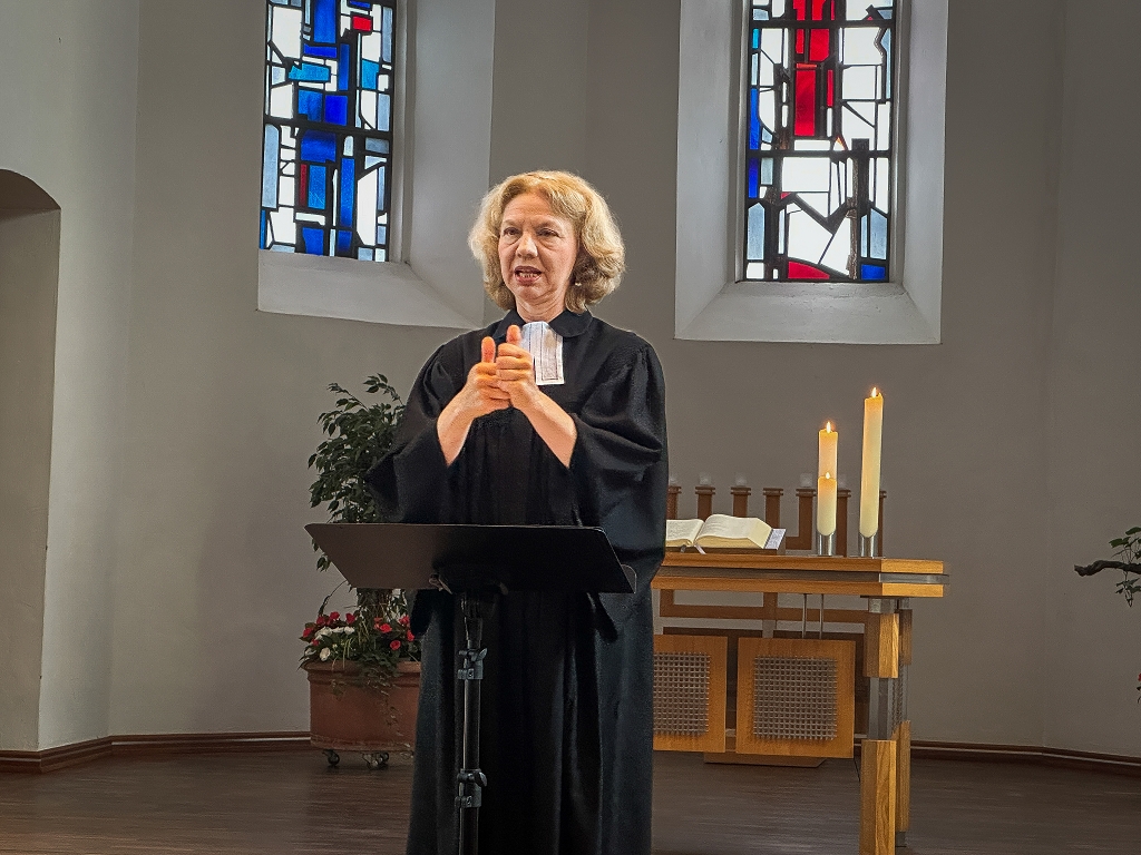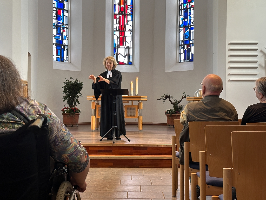 Im Juni predigt sie zur Pfingstbotschaft, sagt, dass bei Gott niemand allein gelassen wird. „Der Heilige Geist hat die Jünger nach Jesu Tod wie eine frische Kraft berührt. So können wir uns auch berühren lassen“, schließt sie die Predigt. Das Vater Unser und das Glaubensbekenntnis werden gebetet – beide Gebete folgen einer festen Abfolge von Gebärden, die einige der Gottesdienstbesuchenden mitmachen.