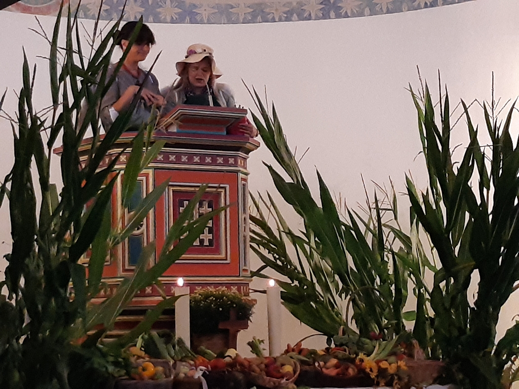 Im Pfarrgarten hinter dem Haus von Pfarrer Gernot Ratajek-Greier pflanzte das Erntepaar, Edith und Thomas Seimen, einen Baum. Für den geplanten Gottesdienst im Pfarrgarten war der Boden dann aber doch zu feucht. Im Gottesdienst sagte Thomas Seimen: "Ernten kann man nicht allein, darum sollte man auch gemeinsam Erntedank feiern."