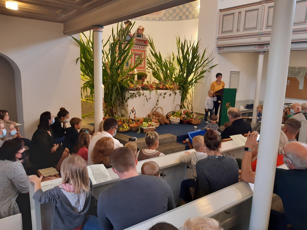 Mit einem Gottesdienst in der Kirche haben die Evangelische Kirchengemeinde Drabenderhöhe und die gesamte Dorfgemeinschaft den zweiten Tag des Festwochenendes begonnen. Der evangelische Kindergarten gestaltete den Gottesdienst mit. Die Kinder hatten den Altar mit Obstkörben geschmückt und erfreuten die Gottesdienstgemeinde mit einem Lied und einem Anspiel.