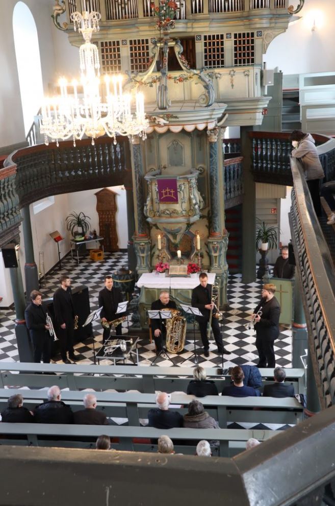 Wenn ich das recht sehe, spielen Sie heute Ihr drittes Konzert auf ihrer Tournee von „Brass for peace in Ukraine“. Was Entfernungen angeht, ist es eigentlich gar nicht so ein weiter Weg, den Sie von der Ukraine kommend zu uns zurückgelegt haben, anders, als viele Deutsche gedacht haben mögen vor dem 24. Februar, vor Kriegsbeginn.