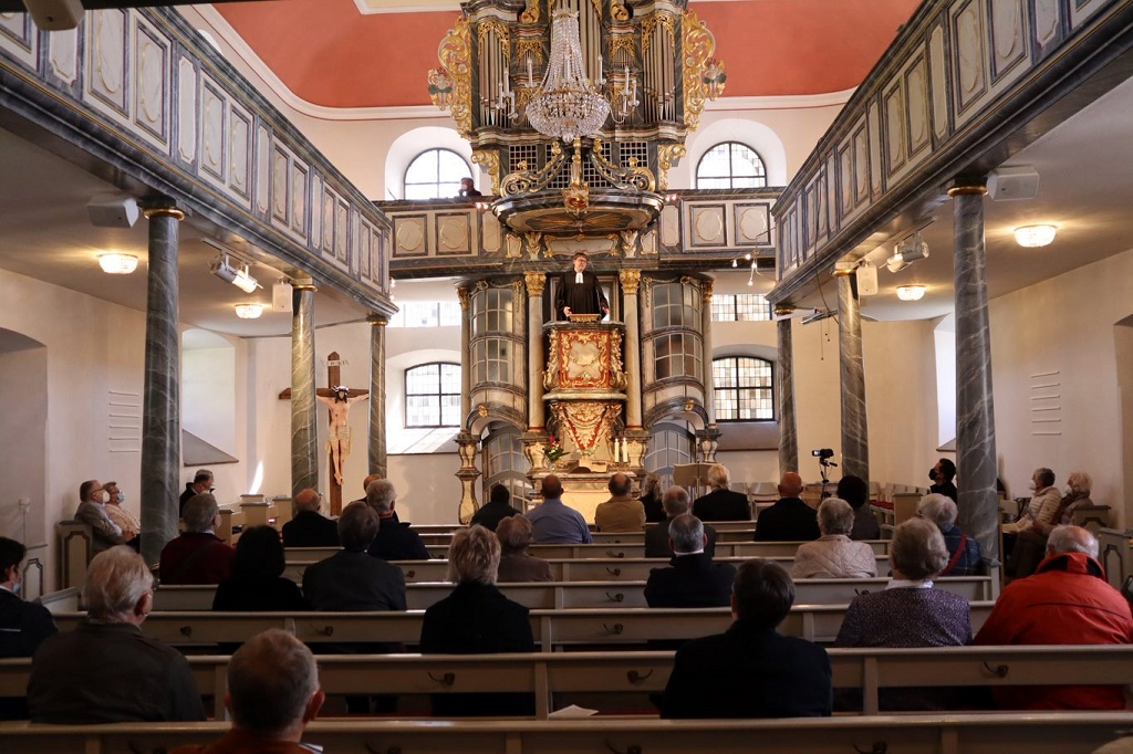 Kirchmeister Frank Dannenberg begrüßte die Festgemeinde in der - nach den stark einschränkenden Corona-Regeln - voll besetzten Kirche. Pfarrer Dr. Oliver Cremer übernahm die Lesung und zusammen mit Prädikantin Birgit Amelsberg die Liturgie. Michael Braun, Superintendent des Kirchenkreises An der Agger, hielt die Predigt - hoch oben auf der Kanzel. Diakon Dietrich Dyck übernahm das Videostreamen. Die musikalische Gestaltung übernahmen einige Sängerinnen und Sänger der Kantorei Rosbach unter der Leitung von Michael Ullrich und die Bläser von RoDa-Brass unter Leitung von Walter Rekowski.