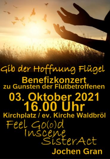Feel Go(o)d - Inscene - Sister Act: Die Waldbröler Gospelchöre sind dabei wenn es M Sonntag, 3. Oktober 2021, 16 Uhr auf dem Kirchplatz an der evangelischen Kirche heißt: "Gib der Hoffnung Flügel". Die Evangelische Kirchengemeinde Waldbröl veranstaltet dieses Benefizkonzert zu Gunsten der Flutbetroffenen. Pfarrer Jochen Gran moderiert. Herzliche Einladung.