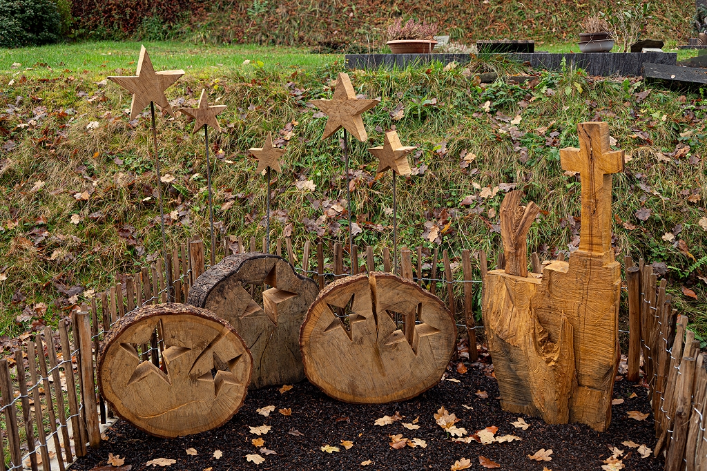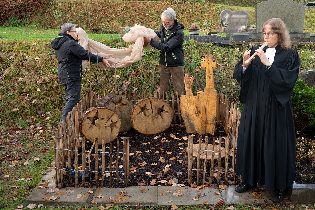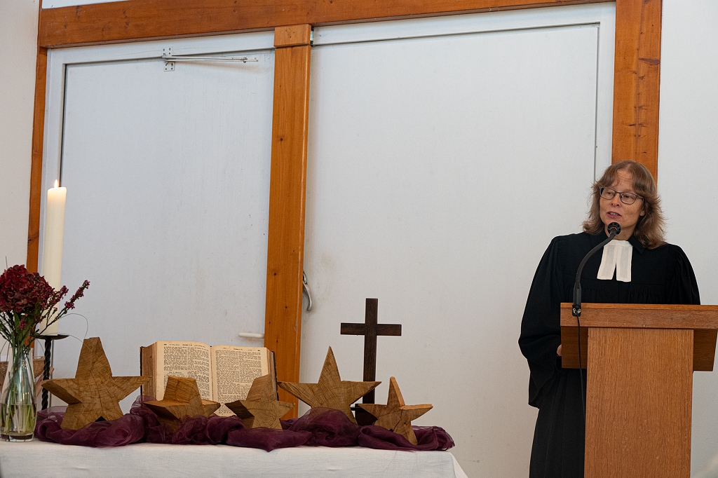Pfarrerin Anja Karthäuser betonte: "Es ist wichtig, der Trauer Ausdruck zu geben." Es gebe viele tröstliche Rituale gerade in dieser Jahreszeit. Die Einweihung der Skulpturen im Trauergarten schließe an den Friedhofstag im Sommer an, bei dem auch der Sternenkinderfriedhof eröffnet wurde. Ein Teil des Kunstwerks – die fünf Sterne – standen im Gottesdienst auf dem Altar in der Trauerhalle.
