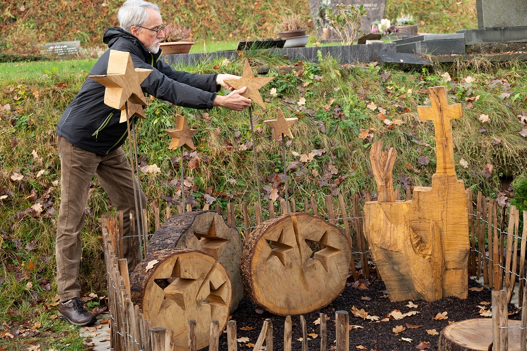 In einer feierlichen Prozession wurden die fünf Sterne zum Sternenkinder Friedhof gebracht: ein besonderes Projekt an einem besonderen Ort. Vor vier Monaten bei einem Orgelkonzert in Lieberhausen entstand der Kontakt zwischen Pfarrerin Anja Karthäuser und dem Künstler Uwe Wintersohl, der selber diese Hoffnung und Freude auf ein Kind erlebte mit traurigem Ausgang. Dadurch habe ihn das Projekt persönlich so angesprochen und er habe gerne die Gestaltung übernommen. "Es musste etwas mit Sternen zu tun haben und das Symbol der Hoffnung mit dem Engel dazu." Daneben das Kreuz, was zusammen das Leben mit dem Tod verbindet. Für Wintersohl sei zudem der Baum das Symbol des Lebens. Die Eichenfragmente stammen vom Windbruch und haben natürliche Risse im Holz - Symbole für die Risse im Leben.