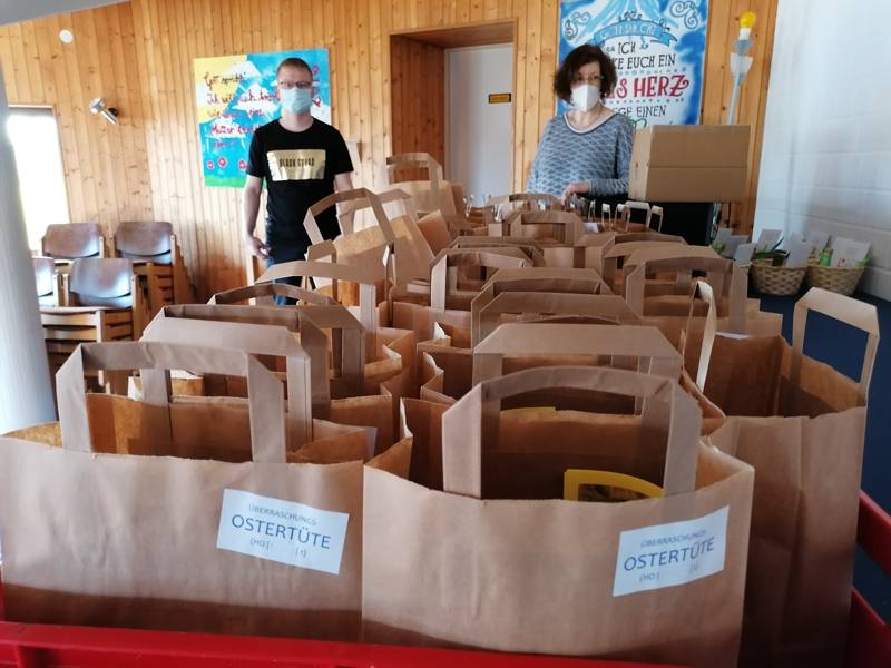 Gründonnerstag und Karfreitag bot die Gemeinde Audio-Gottesdienste mit Abendmahl an. Bereits ab dem Karsamstag spielten Teamer aus der Kinder- und Jugendarbeit den Osterhasen und brachten Osternester zu den Kindern nach Hause. Neben etwas Süßem waren darin auch eine Bastelanleitung, ein Dorfspiel-Quiz und ein Geschichten-Flyer zu Ostern enthalten. Diese Form der Kindergruppen-Arbeit auf Distanz wird in der Gemeinde (mit Unterbrechungen) bereits seit einem knappen Jahr durchgeführt.