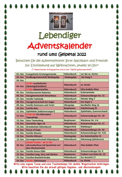 Jeden Abend um 18 Uhr öffnet sich rund ums Gelpetal ein Adventskalender zur Einstimmung auf Weihnachten. Die Gäste erwartet gemeinsames Advents- und Weihnachtsliedersingen, besinnliche Geschichten und Texte, Musik, Heißgetränke - jeden Tag etwas anderes. Bitte eigene Tasse mitbringen.