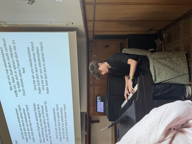 Die getröstete Gemeinde feiert im Anschluss das Abendmahl. Celina, Leo und Lena führen zwei Abendmahlsgruppen souverän in den Altarraum und wieder hinaus. Obwohl der Saftvorrat deutlich zur Neige geht, behalten sie die Nerven und nehmen im Anschluss selbst in aller Ruhe Brot und Wein ein, decken das Geschirr ordentlich ab und machen Platz für Celine, Johanna und Michelle, die berührende Fürbitten formuliert haben. Beim Glockenschlag betet Michelle mit der Gemeinde das Vater Unser. Yorik begleitet das Abschlusslied „Möge die Straße“ am Piano. Den Segen lässt das Gottesdienstteam gemeinsam über die Gemeinde prasseln und zieht fröhlich aus der Kirche aus. Dort nehmen die KON26 Lobesworte der begeisterten Gottesdienstbesucher*innen entgegen. Hannah und Joel müssen jetzt noch das Abendmahlsgeschirr spülen.
