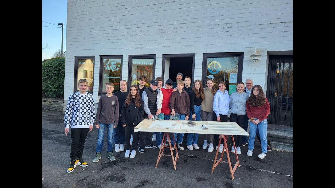 Eben lag die alte Tür noch auf dem Supermarktparkplatz - ein Zufallsfund an einem verregneten Wintertag für Pfarrerin Silke Molnár. Jetzt wird die Tür von den Konfirmanden aus der Kirchengemeide Oberbantenberg-Bielstein abgeschliffen und aufgearbeitet.