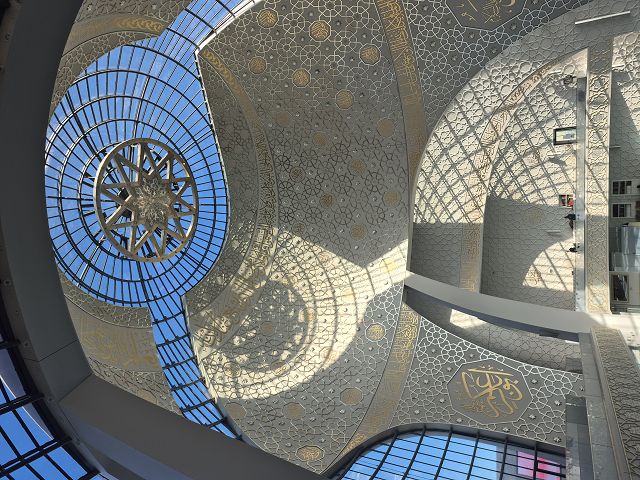 Eine ehrenamtliche Moschee-Guide begleitete die Gruppe durch die Moschee. „Welchen ersten Eindruck haben Sie, wenn Sie jetzt hier in der Moschee sind?“ fragte sie. Die Antworten waren durchweg positiv: einladend, hell, feierlich, spirituell, ansprechend mit den vielen Fenstern und den kunstvollen Kalligrafien an der Wand. Durch die vielen Fenster kann man von außen in die Moschee hineinschauen und von innen heraus auf die vielbefahrene Innere Kanalstraße. In der fast zweistündigen Führung ging es um die Baugeschichte des imposanten Gebäudes von Paul Böhm aus der renommierten Kölner Architektenfamilie Böhm, um Glaubens- und Gebetspraxis und interkulturelle und interreligiöse Praxis. Viermal in der Woche gibt es öffentliche Führungen: mittwochs, freitags, samstags und sonntags jeweils um 15.15 Uhr. Die Moschee sei aber immer, auch abseits der Führungen öffentlich zugänglich. „Kommen Sie ruhig herein, Sie können beim Gebet zusehen oder mitmachen. Frauen können unten mit den Männern beten oder wenn sie für sich sein wollen oben auf der Balustrade.“ Die Schuhe werden am Eingang ausgezogen und komfortabel in abschließbaren Schränken verstaut. Frauen werden gebeten, aus Respekt vor Gott und Zeichen der Andacht den Kopf zu bedecken. Alle Z-Kurs-Teilnehmerinnen hatten Tücher oder Schals dabei und hatten viel Spaß beim ungewohnten Binden der Tücher.