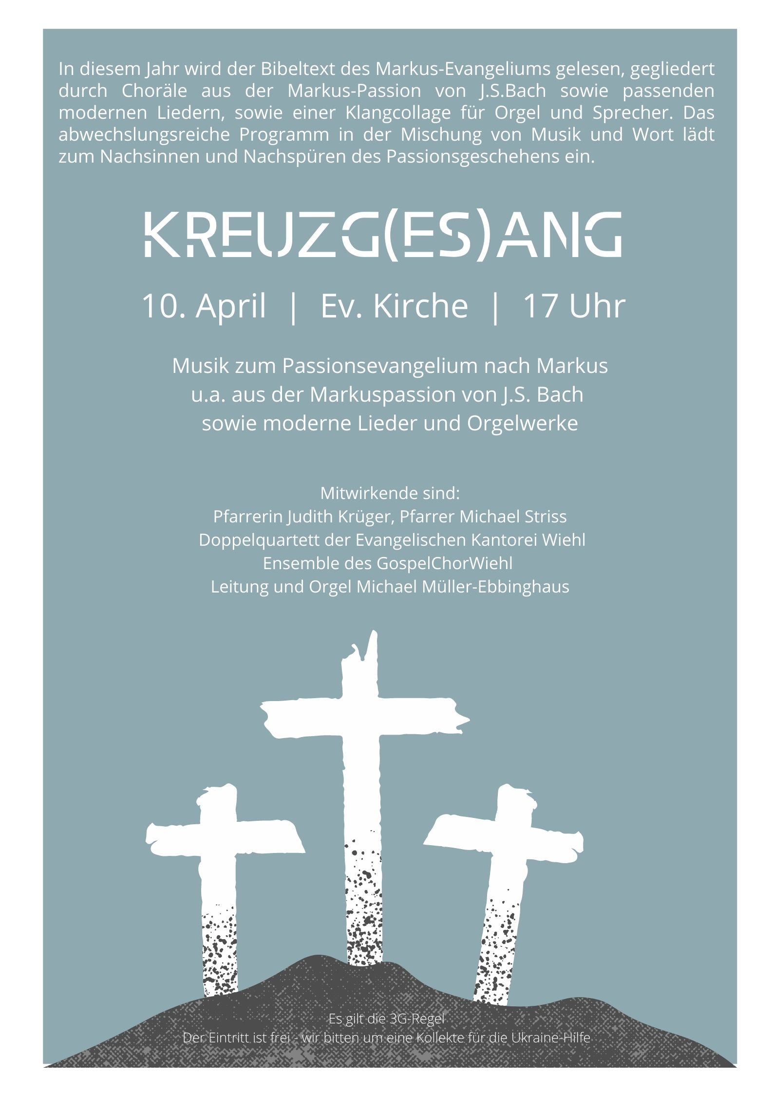 10.4., 17 Uhr, ev. Kirche Wiehl, Kreuzg(es)ang, Musik zum Passionsevangelium nach Markus, moderne Lieder und Orgelwerke und Texte zur Passion