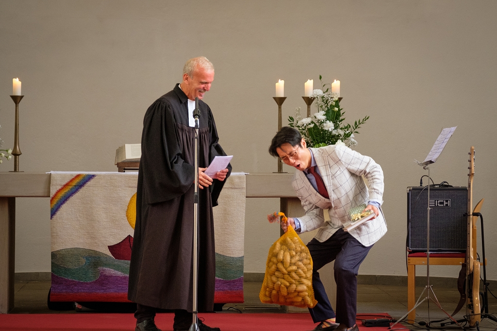 Ein wenig plauderte er dazu noch über das Kochen, das in Südkorea wertgeschätzt werde und auch zum Abbau von Stress diene. Von Jochen Gran wurde der neue Kantor– zu Doo-Jin Parks Amüsement und zu dem der Gemeinde – mit einem Sack Kartoffeln als „typisch oberbergisches Willkommen“ beschenkt.