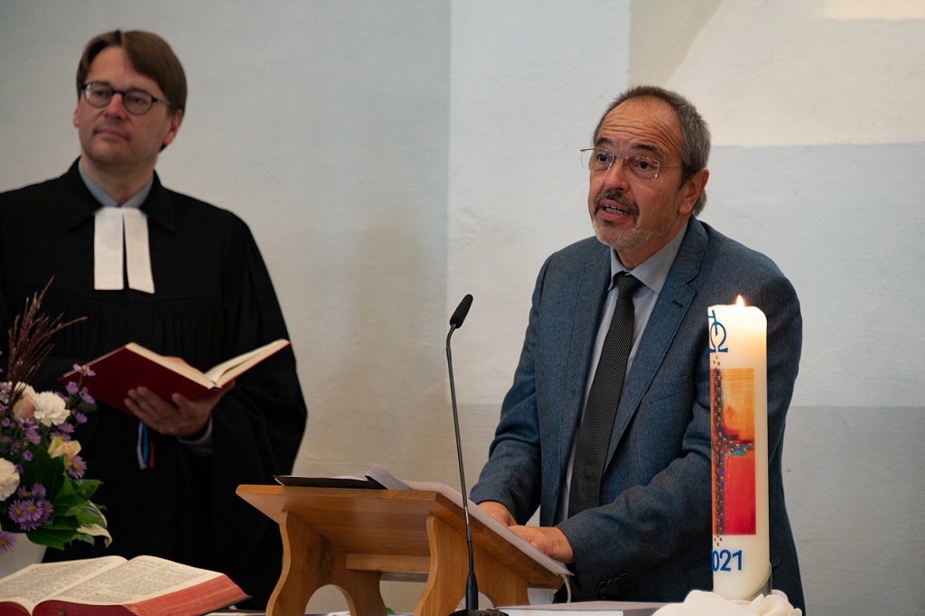 Pfarrer Michael Striss ging in seiner Einführungspredigt auf die Einheit ein. Dabei wies er auf die Spaltung der Gesellschaft hin, die nicht erst seit Corona da sei. Andere und begründete Sichtweisen gab es schon immer, die Debattenkultur habe sich jedoch verändert – der Ton werde rauer und persönlicher. Was haben Christen dazu zu sagen, fragte er und wies auf das 4. Kapitel des Epheserbriefes hin. Spaltungen gäbe es auch in der Kirche bei Fragen zu Frömmigkeit, Musik in der Gemeinde oder zur Wahl eines Abendmahlstisches.