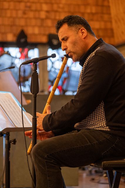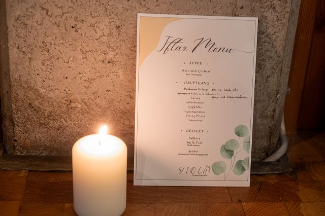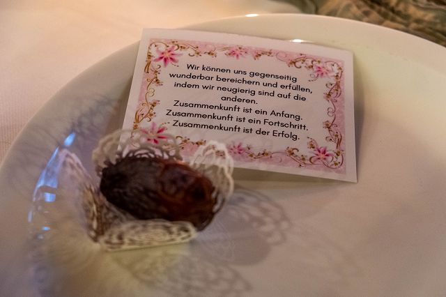 Und schließlich erklingt an diesem Abend meditative Flötenmusik, gespielt auf der Ney, einem Instrument, das wie ein langes melodisches Atmen klingt. Viele Gäste hören mit geschlossenen Augen zu – auch als vor dem eigentlichen Essen Efraim Can den Ruf des Muezzins im Kirchsaal ertönen lässt. Der Muezzinruf zum Abendgebet signalisiert im Ramadan das Fastenbrechen, und so wird nun gespeist - zunächst traditionell eine Dattel -, in großer Gemeinschaft und Zugewandtheit.