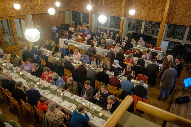 Das Gefühl, willkommen zu sein, stellt sich ein. Jeder, der sich der gemütlich beleuchteten evangelischen Kirche in Schnellenbach nähert, wird beim Eintreten mit einem herzlichen Lächeln begrüßt. Schnell sind die Plätze an den langen Tafeln besetzt, Menschen umarmen sich, lachen, plaudern entspannt. Rund 100 Gäste muslimischen und christlichen Glaubens sind hier, um an diesem Abend gemeinschaftlich das Fastenbrechen (Iftar), im Monat Ramadan das tägliche Ende des Fastens, zu begehen.
