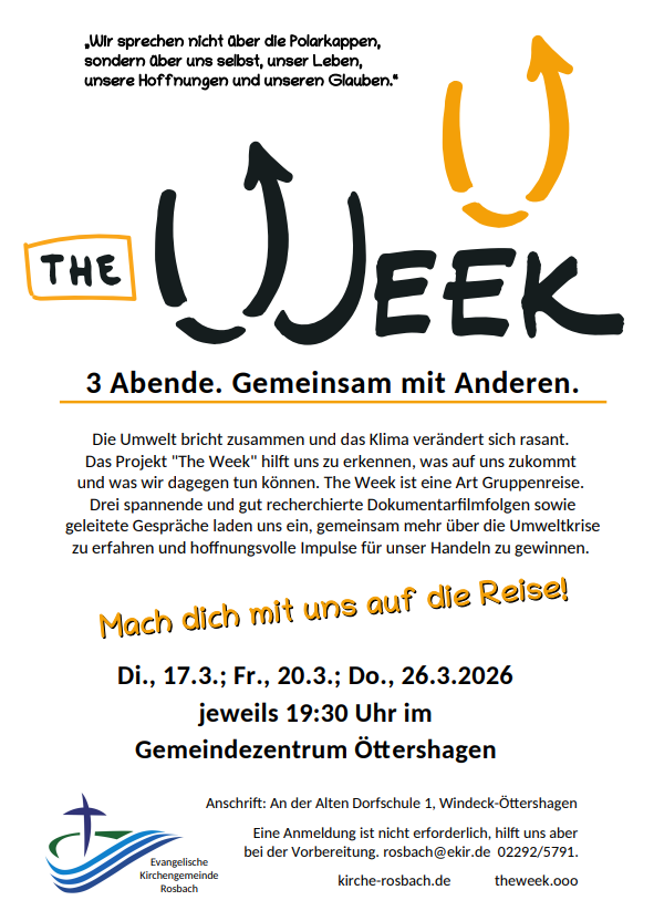 Die Evangelische Kirchengemeinde Rosbach (Windeck) lädt ein zum Projekt „The week“: The week ist eine Filmwoche mit drei aufeinander aufbauenden Dokumentarfilmen zum Thema Klimaschutz, Bewahrung der Schöpfung und den Glauben. „Mach Dich mit uns auf die Reise!“