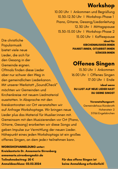 Drei Referenten vom Popverband der Evangelischen Kirche im Rheinland haben neue Lieder im Gepäck und zeigen, wie man sie am Piano, an der Gitarre oder per Gemeindesingen ansprechend gestalten kann. Sie bringen neue Lieder und Noten für Musiker mit. Der Workshop ist ideal für Kirchenmusiker, Pianisten, Gitarristen und Sänger.