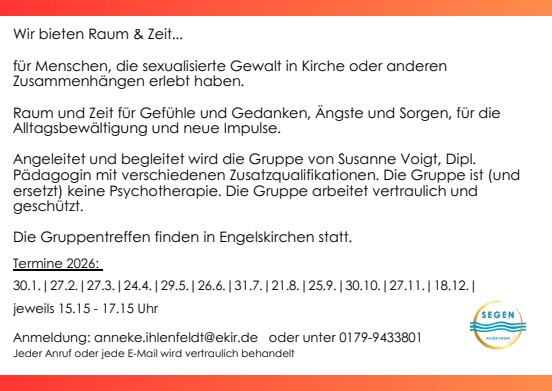 Die Gesprächsgruppe „Raum und Zeit“ für Menschen, die sexualisierte Gewalt erlebt haben, trifft sich auch 2026 regelmäßig. Die Gruppentreffen in Engelskirchen finden einmal im Monat statt, jeweils freitags von 15.15 bis 17.15 Uhr, am 30.1., 27.2., 27.3., 24.4.,29.5., 26.6., 31.7., 21.8.,25.9., 30.10., 27.11. und am 18.12.2026.
