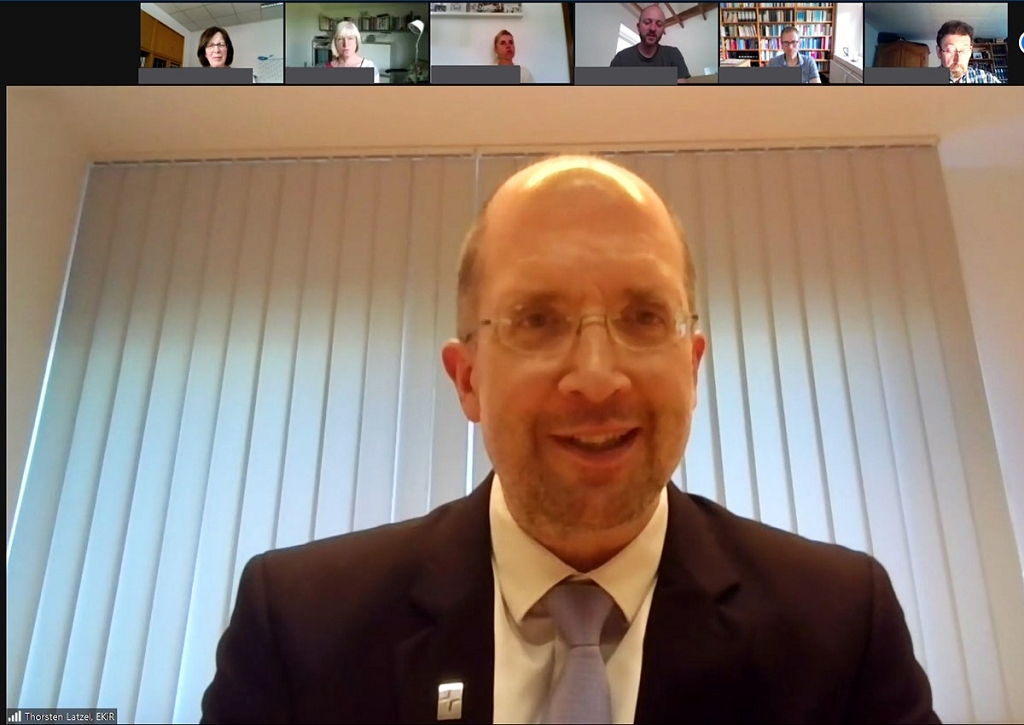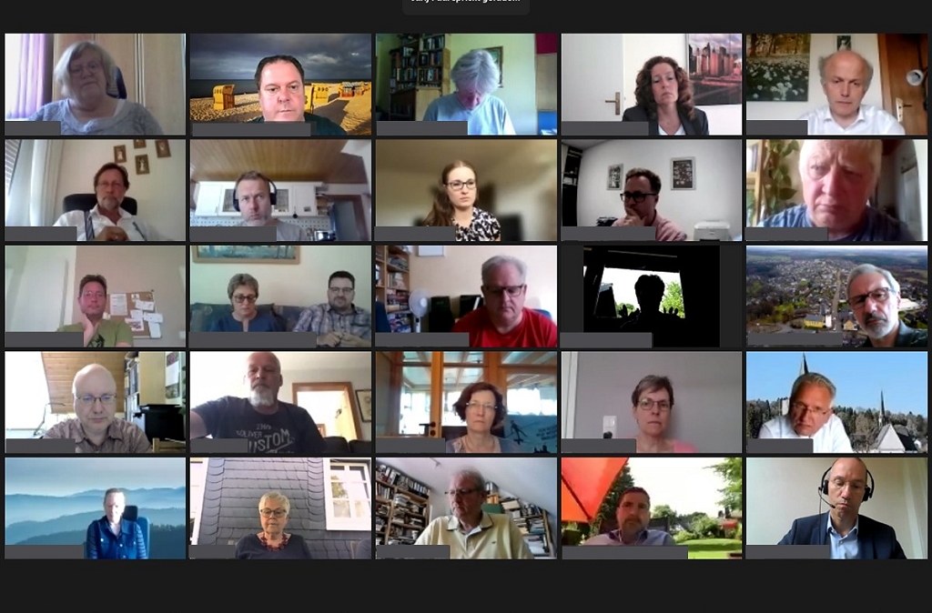 Thorsten Latzel präsentierte auf der digitalen Synodalversammlung seine Gedanken und Ideen unter dem Titel „Kirche der Zukunft“. Mitglieder- und Relevanzverlust seien nicht neu: „Die Faktoren, die dieser Entwicklung zugrunde liegen, kennen wir seit Jahrzehnten. Als Kirche haben wir kein Erkenntnis-, sondern ein Umsetzungsproblem. Wir sind gut im Diskutieren, aber schlecht im Verändern. Unser Problem ist, dass wir in alten Strukturen verhaftet bleiben und uns nicht konsequent auf die grundlegend veränderten Voraussetzungen einstellen.“ Superintendent Michael Braun hatte den Präses virtuell am Bildschirm begrüßt. Thorsten Latzel war live zugeschaltet aus Mainz, wo er am Nachmittag seinen Antrittsbesuch bei Ministerpräsidentin Malu Dreyer hatte. Sie habe ihm gesagt, noch nie habe sie so viele Gottesdienste besucht – online – wie in der Coronazeit. Ebenso hatte Braun die mehr als 120 Synodalen des Kirchenkreises sowie weitere Gäste begrüßt, darunter auch die Schülerin Chiara Schiewe, die Theologie studieren möchte, ebenso den Kirchenkreisbegleiter Oberkirchenrat Henning Boecker und Arno Molter, den neuen Leiter der Evangelischen TelefonSeelsorge Oberberg. Nach den Synodalversammlungen zum Pfarrstellenentwicklungsprozess und der Kreissynode im Herbst war es für die Synodalen erneut ein digitales Treffen.