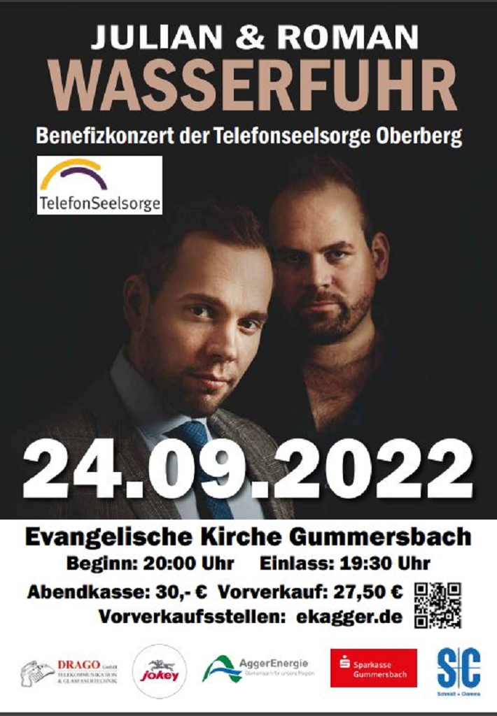 Anlass ist das 30-jährige Bestehen der Evangelischen TelefonSeelsorge Oberberg. Gefeiert wird das Jubiläum mit einem Benefizkonzert der Weltklasse-Jazzmusiker Julian und Roman Wasserfuhr am Samstag, 24. September 2022, 20 Uhr in der evangelischen Kirche in Gummersbach. Die Brüder Wasserfuhr bieten Jazzmusik vom Feinsten an Trompete und Piano.