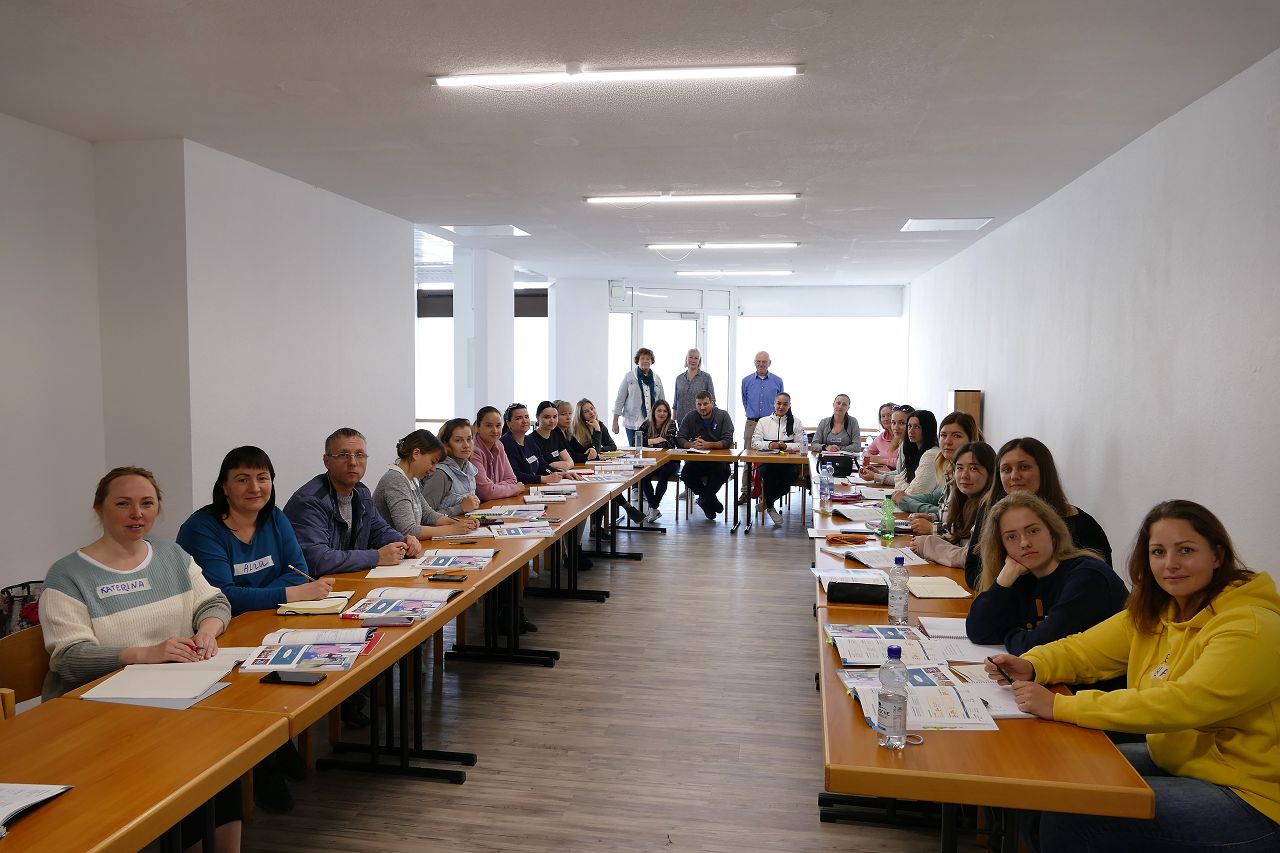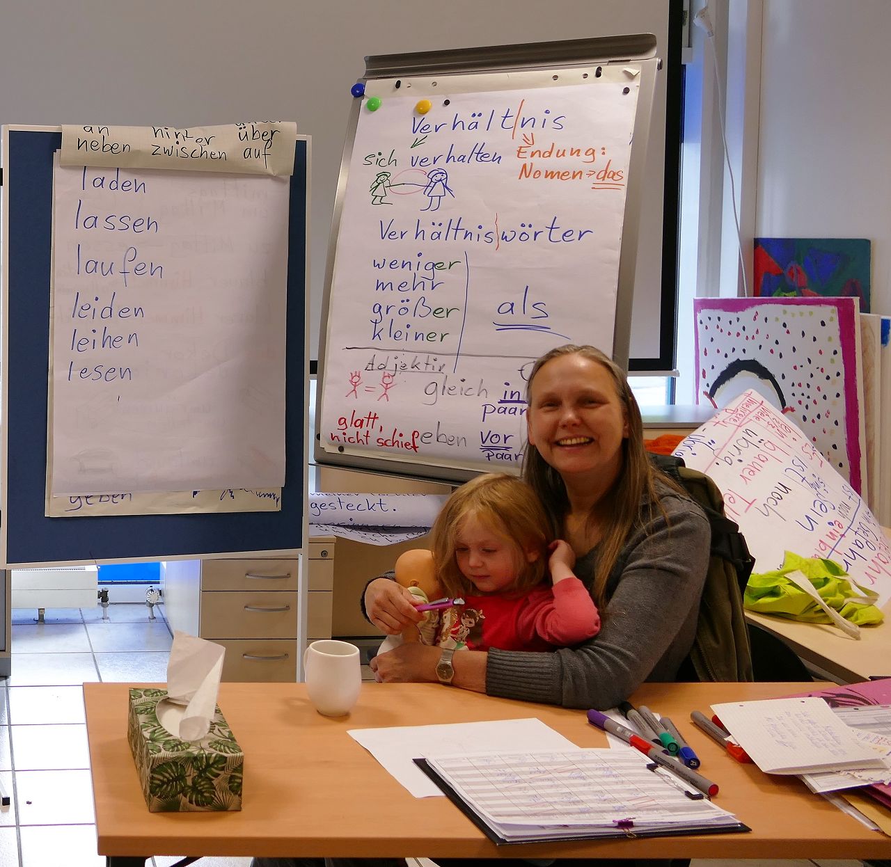 An diesem Morgen sind es sieben Frauen in dem Mütterkurs: Yuliaa, Tatyana, Oksana, Viktoria, Vira, Ludmilla und Eva mit Kindern zwischen sechs Monaten und fünf Jahren. Die Frauen hoffen auf einen Kindergartenplatz, damit sie einen Integrationskurs machen können. Bis es soweit ist, lernen sie zum Einstieg in die deutsche Sprache mit dem Buch „Erste Schritte plus“ Begriffe und Formulierungen für das Alltagsleben. Die Kinder malen. basteln und spielen in der Zeit.