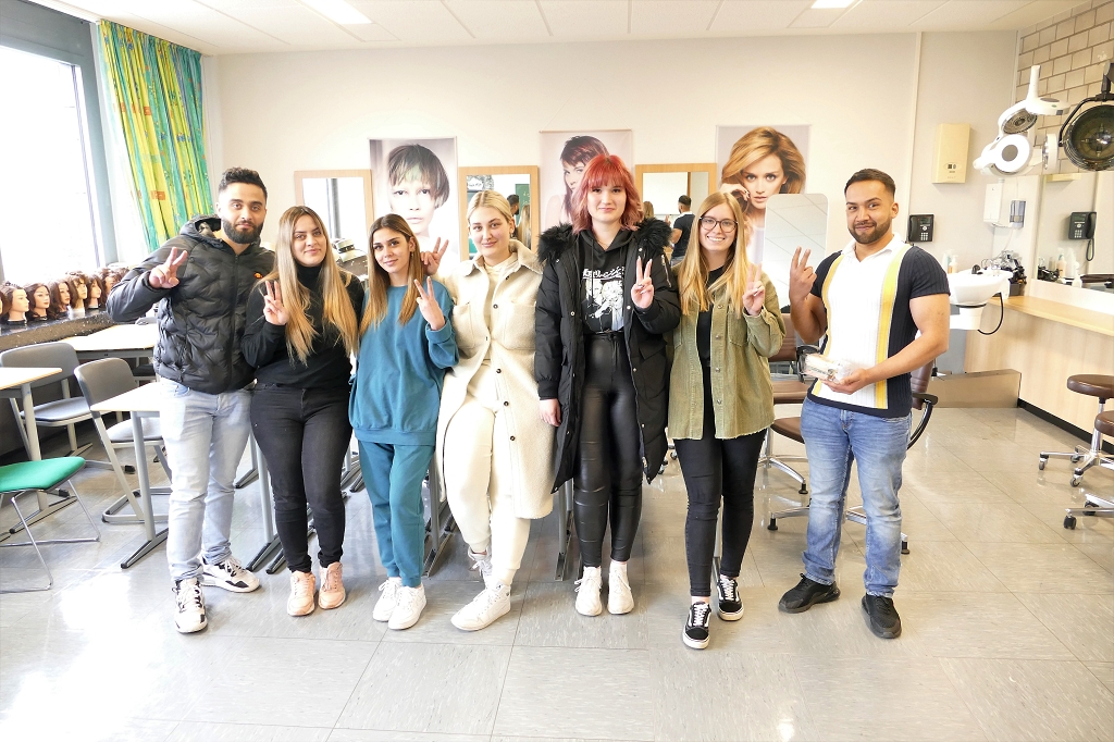 Die Schülerinnen und Schüler der FriseurInnenklasse sind im dritten Lehrjahr und haben in zwei Monaten ihre Abschlussprüfungen. Sie verstehen ihr Handwerk und arbeiten, wenn sie nicht in der Berufschule sind, in ihren Salons in Bielstein, Bierenbachtal, Bergisch Gladbach, Gummersbach, Oberwiehl und Vollmerhausen.