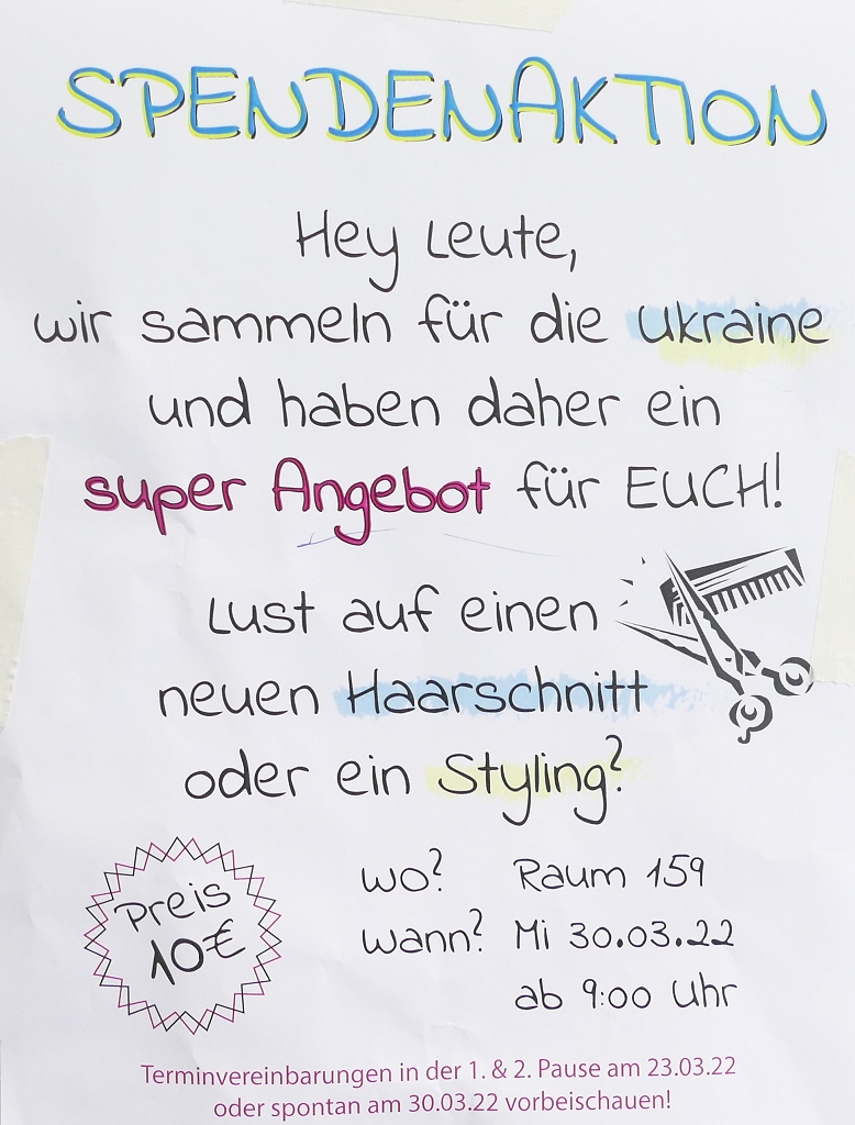 Die Werbezettel für die Spendenaktion hingen in der ganzen Schule: "Hey Leute, wir sammeln für die Ukraine und haben daher ein super Angebot für Euch! Lust auf einen neuen Haarschnitt oder ein Styling? Wo? Raum 159 Wann? Mi 30.3.22 ab 9:00 Uhr. Terminvereinbarung in der 1. & 2. Pause am 23.03.22 oder spontan am 30.03.22 vorbeischauen."