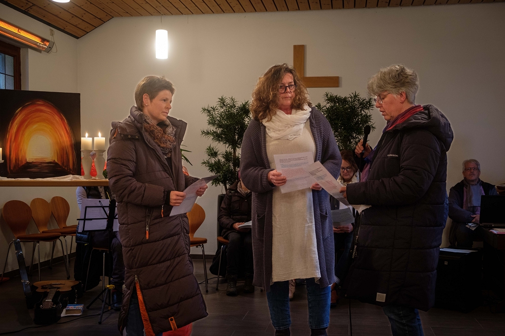 Im Gottesdienst empfinden die Anwesenden das Ostergeschehen nach, Pfarrer Jochen Gran aus Waldbröl gibt die geistlichen Impulse. Dabei erinnert er an den scharfen Kontrast der Jubelrufe, als Christus in Jerusalem einzieht, zum schrecklichen „Kreuzige ihn“ der aufgebrachten Menge nur wenig später.